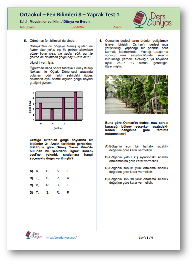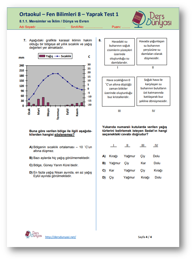 Yaprak Test 1 – Mevsimler ve İklim / Dünya ve Evren