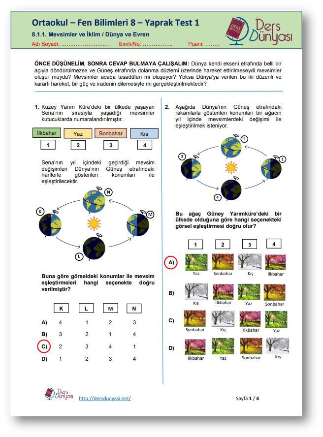 Ortaokul Fen Bilimleri 8. Sınıf Yaprak Testi 1 CEVAP ANAHTARI – Mevsimler ve İklim / Dünya ve Evren