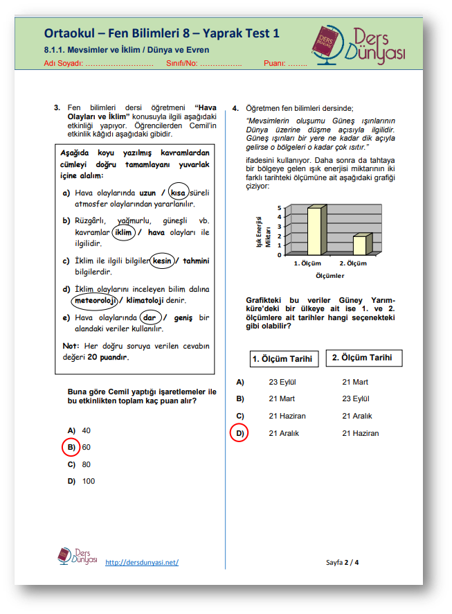 Yaprak Test 2 CEVAP ANAHTARI – Mevsimler ve İklim / Dünya ve Evren