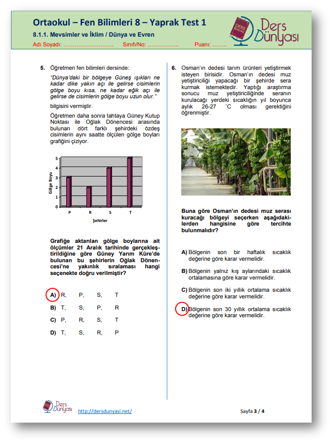 Yaprak Testi 1 CEVAP ANAHTARI – Mevsimler ve İklim / Dünya ve Evren