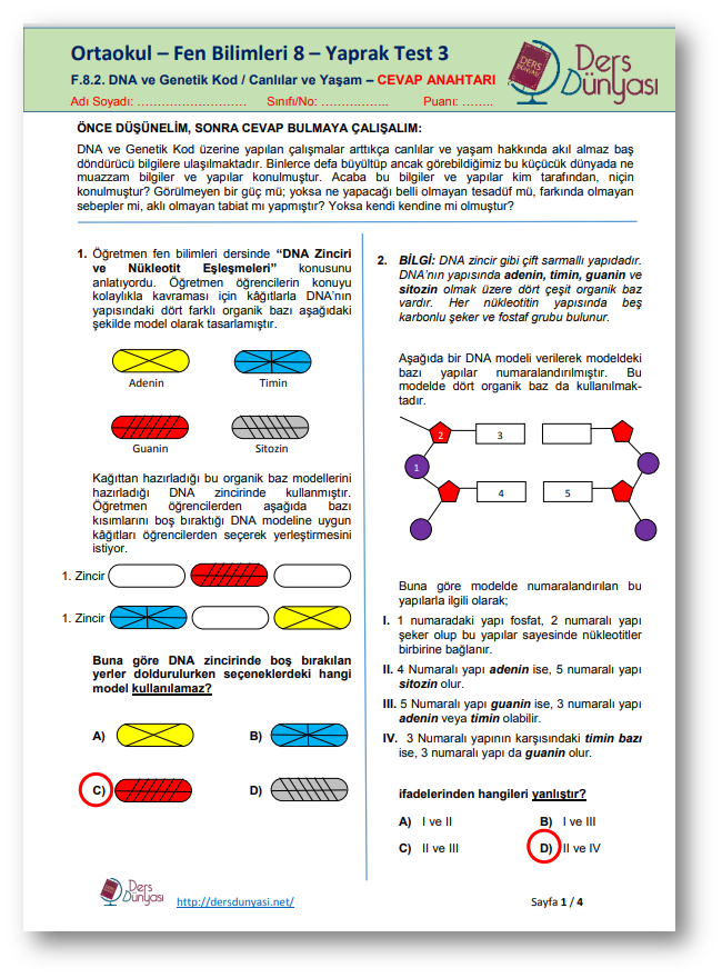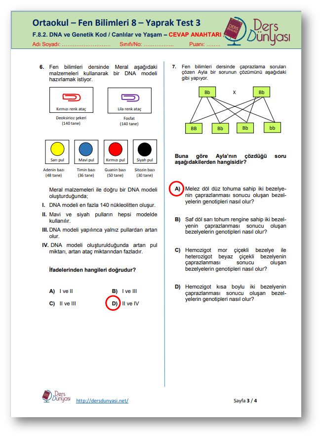 Ortaokul Fen Bilimleri 8 Yaprak Test 3 – CEVAP ANAHTARI – DNA ve Genetik Kod / Canlılar ve Yaşam