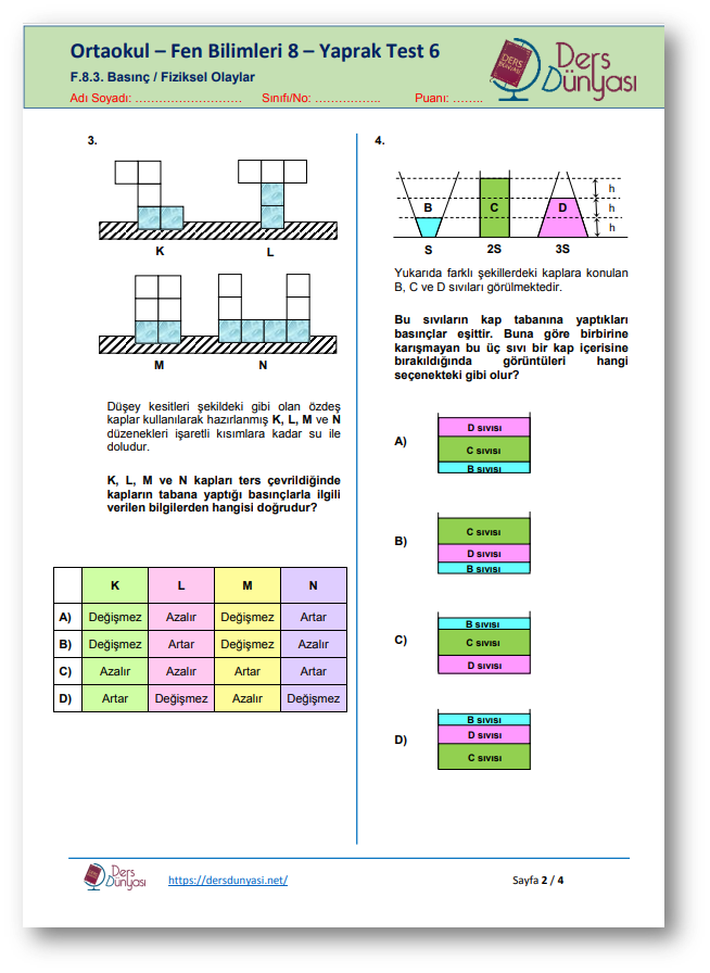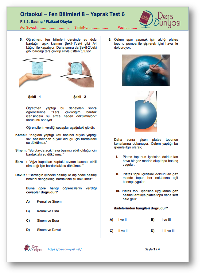 Ortaokul Fen Bilimleri 8. Sınıf Yaprak Test 6 – Basınç / Fiziksel Olaylar
