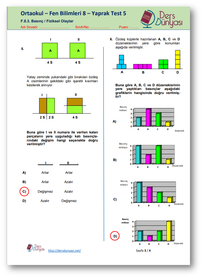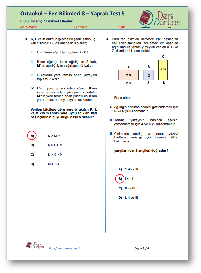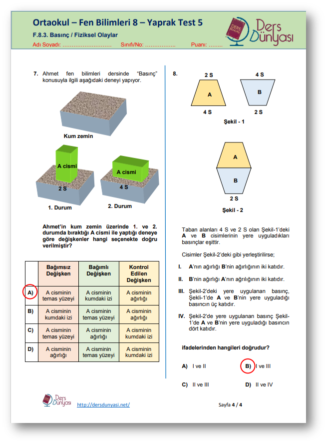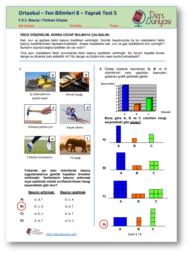 Ortaokul Fen Bilimleri 8 Yaprak Test 5 CEVAP ANAHTARI – Basınç / Fiziksel Olaylar