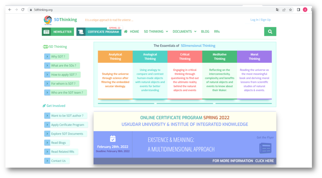 5D thinking is based on belief that ideology-free science and authentic Divine messages do not contradict each other, as they both come from the same source. It assumes that the universe is an elegant book with full of meaning (signs). It considers pure science as a great way to reveal the Divine signs in the book of the universe. The 5D thinking approach aims to help students to derive certain character lessons from scientific knowledge. It is expected to help students to read the universe like an elegant book conveying Divine messages on how to be a better human being through good character.