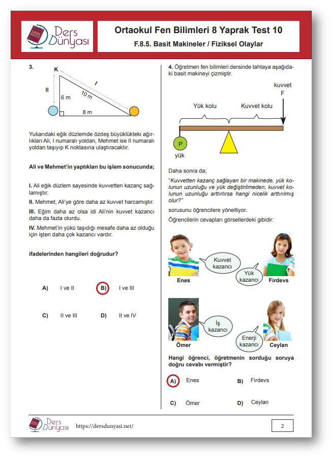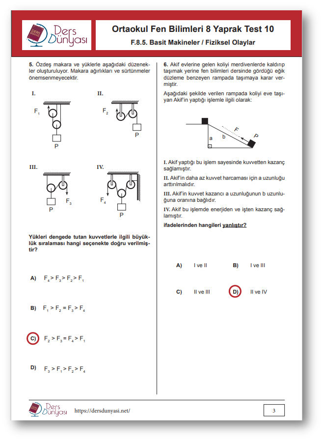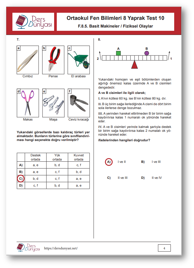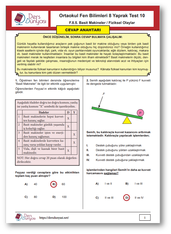 Ortaokul Fen Bilimleri 8. Sınıf Yaprak Test 10 CEVAP ANAHTARI – Basit Makineler / Fiziksel Olaylar