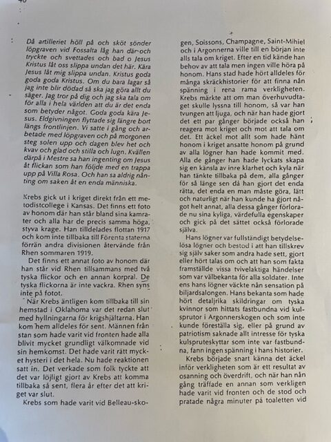 Krebs som hade varit vid Belleau-skogen, Soissons. Champagne, Saint-Mihiel och i Argonnerna ville till en början inte alls tala om kriget. Efter en tid kände hand behov av att tala men ingen ville höra på honom. Hans stad hade hört alldeles för många skräckhistorier för att finna nån spänning i rena rama verkligheten. Krebs märkte att om man överhuvudtaget skulle lyssna till honom, så var han. tvungen att ljuga, och när han hade gjort det ett par gånger började också han reagera mot kriget och mot att tala om det. Ett äckel mot allt som hade hänt honom i kriget ansatte honom på grund av alla lögner han hade kommit med. Alla de gånger han hade lyckats skapa sig en känsla av inre klarhet och kyla när han tänkte tillbaka på dem, alla gånger för så länge sen då han gjort det enda rätta, det enda en man måste göra, lätt och naturligt när han kunde ha gjort något helt annat, alla dessa gånger förlorade nu sina kyliga, värdefulla egenskaper och gick på det sättet också förlorade själva.