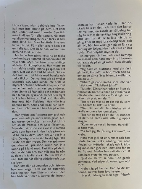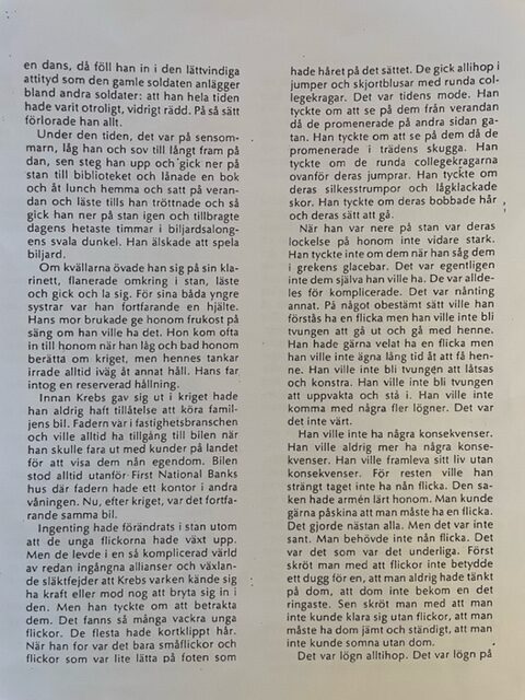 Ingenting hade förändrats i stan utom att de unga flickorna hade växt upp. Men de levde i en så komplicerad värld av redan ingångna allianser och växlande släktfejder att Krebs varken kände sig ha kraft eller mod nog att bryta sig in i den. Men han tyckte om att betrakta dem. Det fanns så många vackra unga flickor. De flesta hade kortklippt hår. När han for var det bara småflickor och flickor som var lite lätta på foten som hade håret på det sättet. De gick allihop i jumper och skjortblusar med runda collegekragar. Det var tidens mode. Han tyckte om att se på dem från verandan da de promenerade på andra sidan ga- tan. Han tyckte om att se på dem då de promenerade i trädens skugga. Han tyckte om de runda collegekragarna ovanför deras jumprar. Han tyckte om deras silkesstrumpor och lågklackade skor. Han tyckte om deras bobbade hår. och deras sätt att gå.
