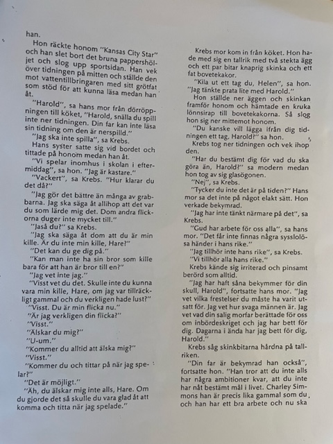 Skrivuppgift: Skriv en dialog mellan Harold Krebs och hans far. Utsmycka gärna samtalet med person- och miljöbeskrivningar. Dialogen behöver inte markera ett avslut på berättelsen, men bör skrivas i novellens anda.