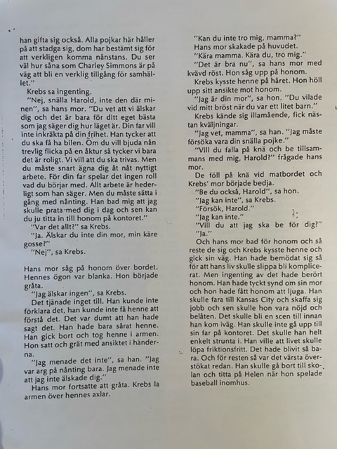 Och hans mor bad för honom och så reste de sig och Krebs kysste henne och gick sin väg. Han hade bemödat sig så för att hans liv skulle slippa bli komplicerat. Men ingenting av det hade berört honom. Han hade tyckt synd om sin mor och hon hade fått honom att ljuga. Han skulle fara till Kansas City och skaffa sig jobb och sen skulle hon vara nöjd och belåten. Det skulle bli en scen till innan han kom iväg. Han skulle inte gå upp till sin far på kontoret. Det skulle han helt enkelt strunta i. Han ville att livet skulle löpa friktionsfritt. Det hade blivit så ba ra. Och för resten så var det värsta över stökat redan. Han skulle gå bort till skolan och titta på Helen när hon spelade baseball inomhus.