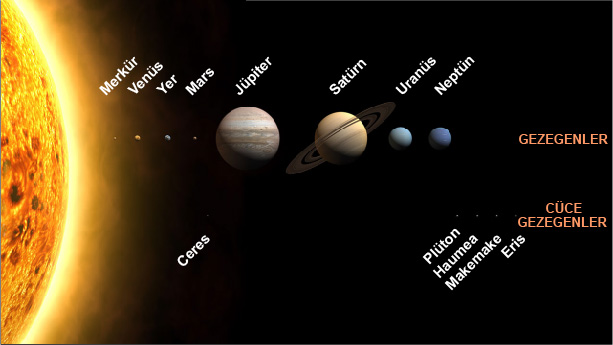 Güneş’ten olan uzaklıklarına göre gezegenler sırasıyla MerkürVenüsDünyaMarsJüpiterSatürnUranüs ve Neptün‘dür. Bu sekiz gezegenin altısının çevresinde doğal uydular döner. Ayrıca dış gezegenlerin her birinin toz ve diğer parçacıklardan oluşan halkaları vardır.