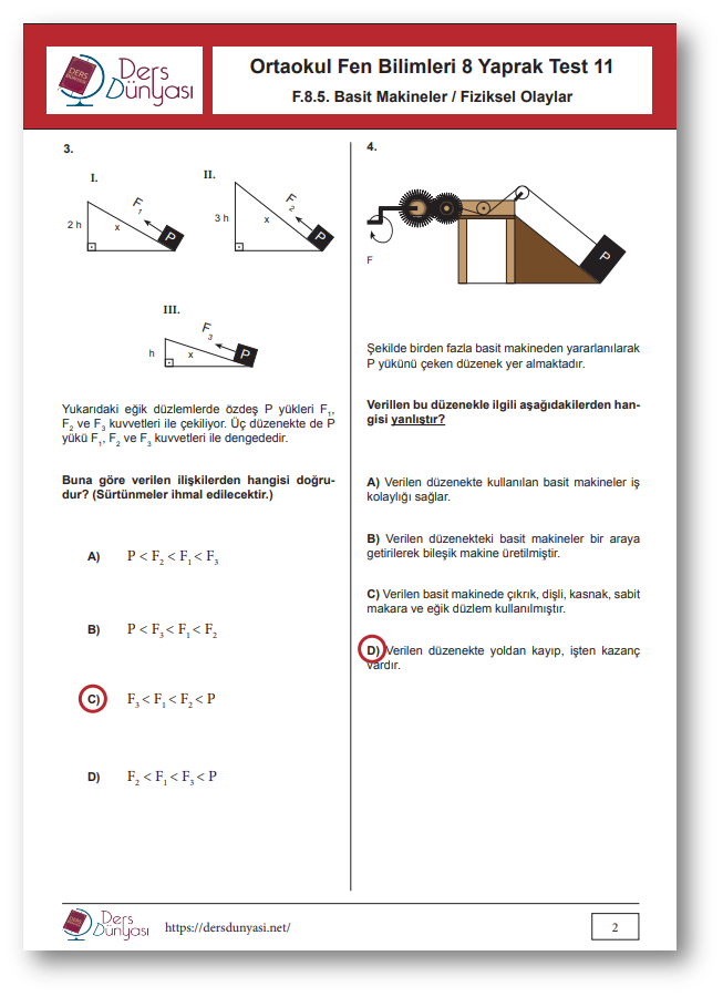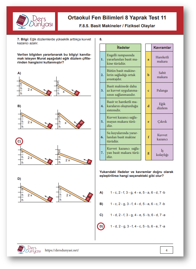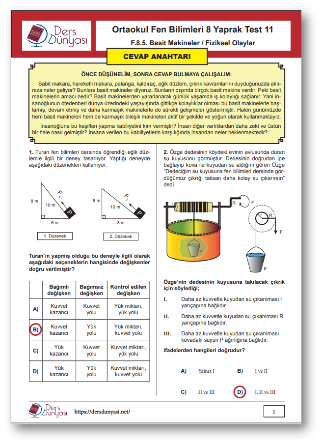 Ortaokul Fen Bilimleri 8. Sınıf Yaprak Test 11 CEVAP ANAHTARI – Basit Makineler / Fiziksel Olaylar