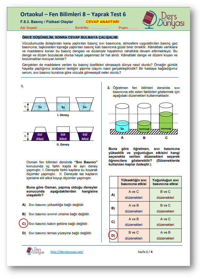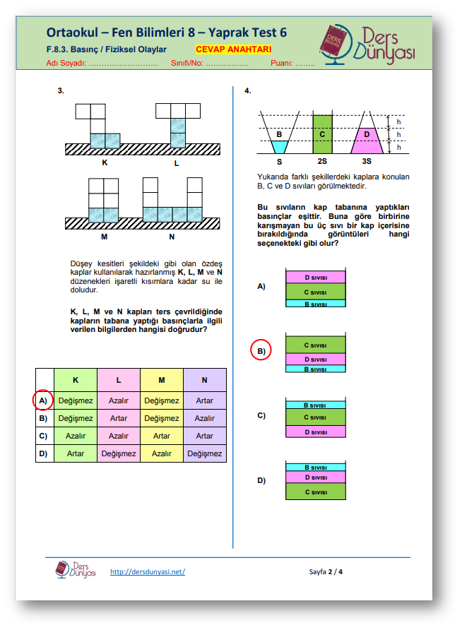 Ortaokul Fen Bilimleri 8. Sınıf Yaprak Test 6 – Basınç / Fiziksel Olaylar - CEVAP ANAHTARI