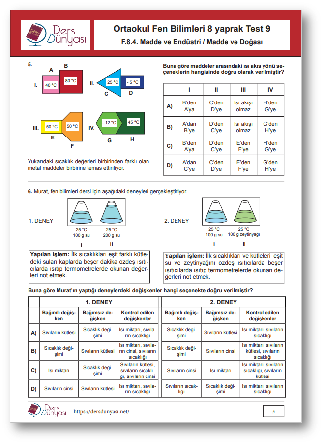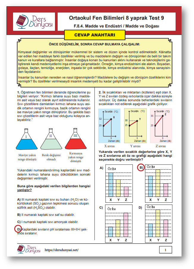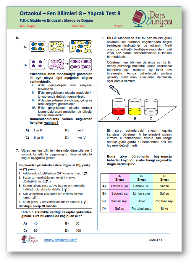 Yaprak Test 8 CEVAP ANAHTARI – Madde ve Endüstri / Madde ve Doğası