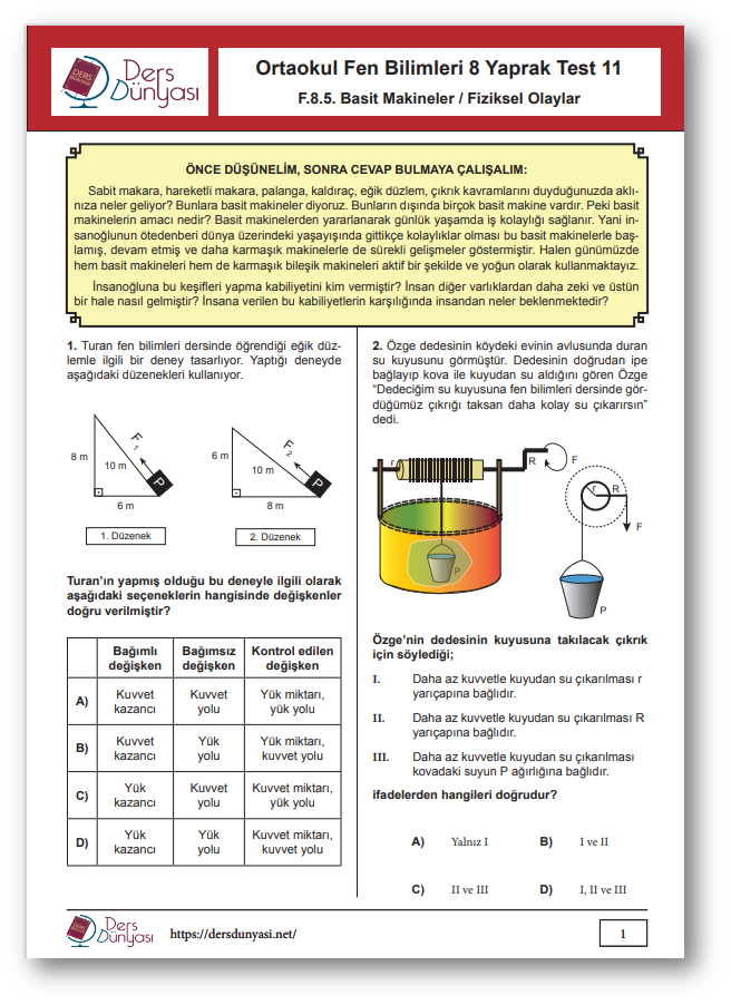 Ortaokul Fen Bilimleri 8. Sınıf Yaprak Test 11 - Basit Makineler / Fiziksel Olaylar