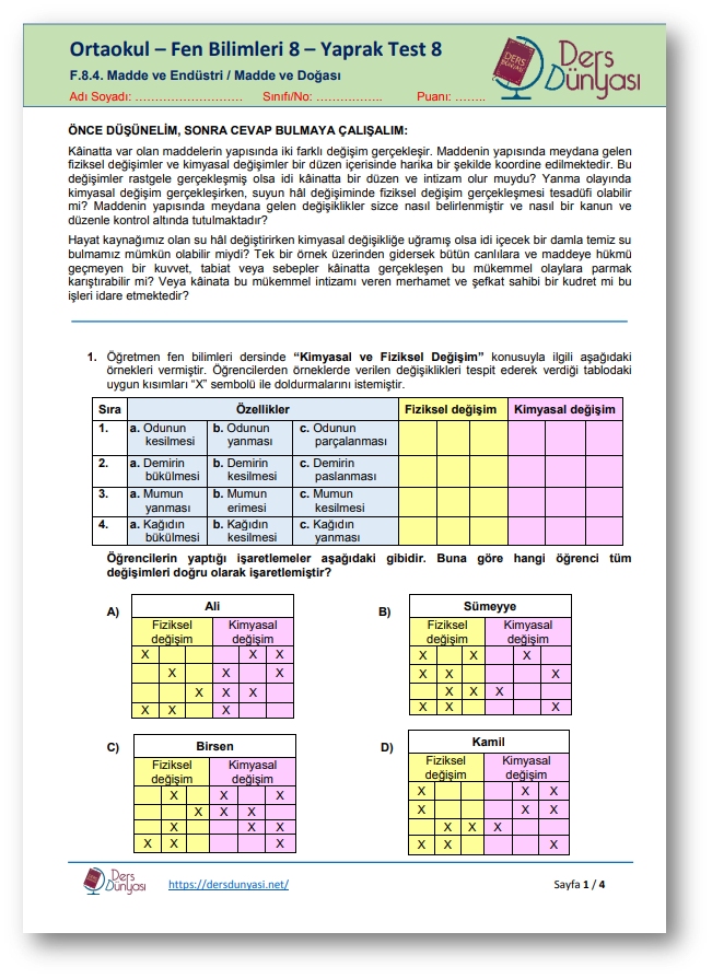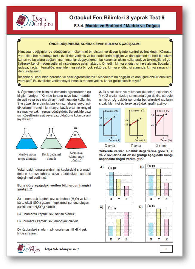 Yaprak Test 8 – Madde ve Endüstri / Madde ve Doğası