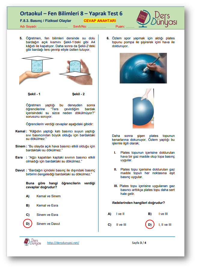 Yaprak Test 5 CEVAP ANAHTARI – Basınç / Fiziksel Olaylar