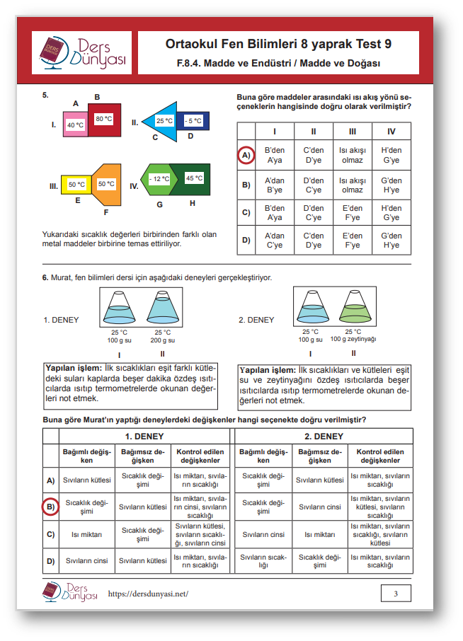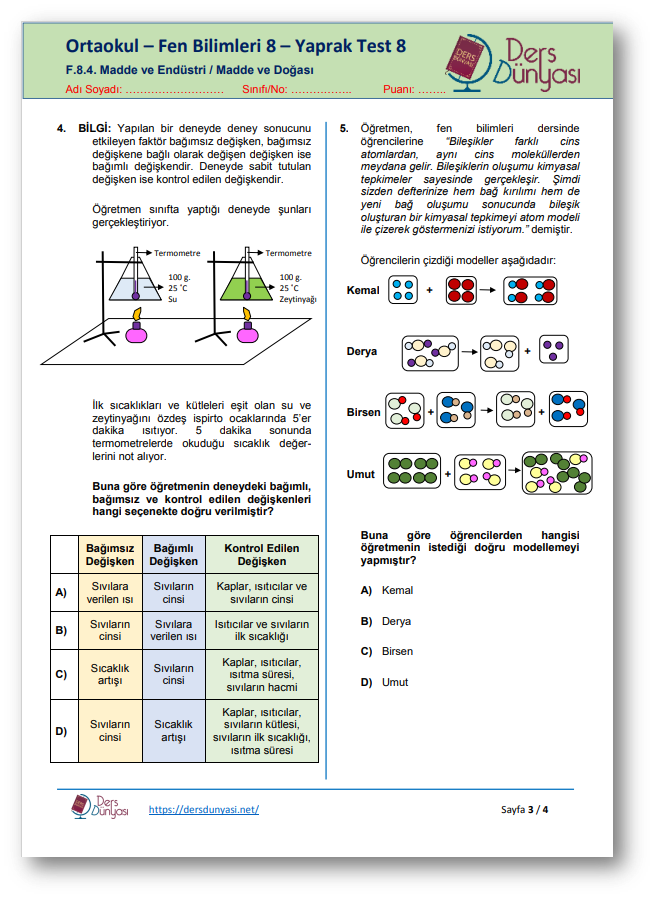 Ortaokul Fen Bilimleri 8. Sınıf Yaprak Test 8 CEVAP ANAHTARI – Madde ve Endüstri / Madde ve Doğası