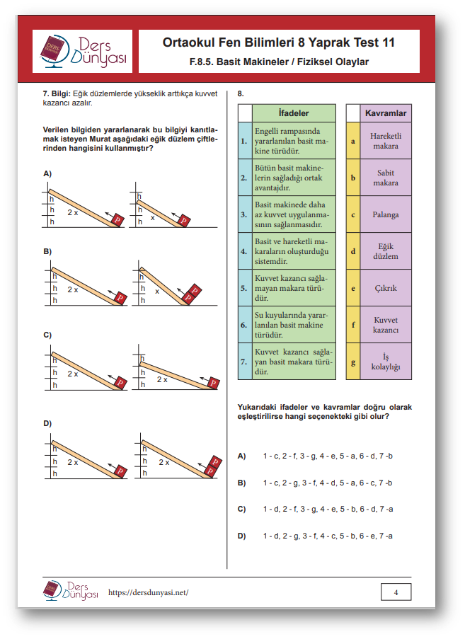 Ortaokul Fen Bilimleri 8. Sınıf Yaprak Test 11 CEVAP ANAHTARI – Basit Makineler / Fiziksel Olaylar