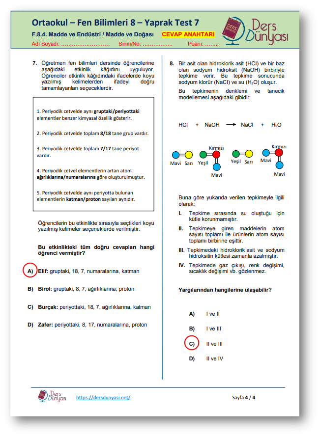 Ortaokul Fen Bilimleri 8. Sınıf Yaprak Test 7 – Madde ve Endüstri / Madde ve Doğası – CEVAP ANAHTARI