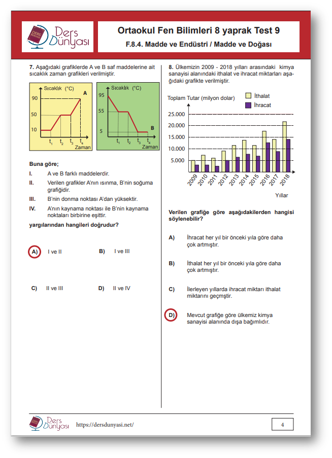 Ortaokul Fen Bilimleri 8- Sınıf Yaprak Test 7 - Madde ve Endüstri / Madde ve Doğası - CEVAP ANAHTARI
