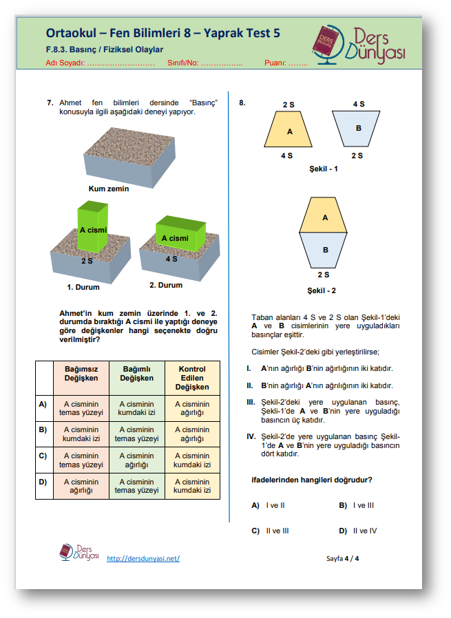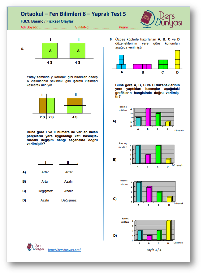 Bu sayfada Liselere Geçiş Sistemi (LGS) sınavına girecek öğrenciler için ortaokul 8. Sınıf Fen Bilimleri Dersi Fiziksel Olaylar konu alanı 3. Ünite Basınç ile ilgili çıkabilecek sorulara örnekler verilmiştir. PDF olarak indirebilir, çoğaltabilir ve kullanabilirsiniz. Ücretsizdir, herhangi bir telif ücreti ödemenize gerek yoktur.